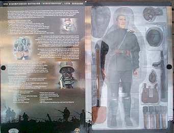 This is destined to be a classic. Armed with a MP-18 submachine gun and snaildrum magazine. Comes with 4 stick grenades with grenade bag, a real cloth bread bag. A gas mask and can that he can wear, a water bottle, bed roll, mess kit, shovel, and a camouflaged M-18 helmet. This figure is museum quality and the facial features and hands look real. Incredible detail and painstaking authenticity.