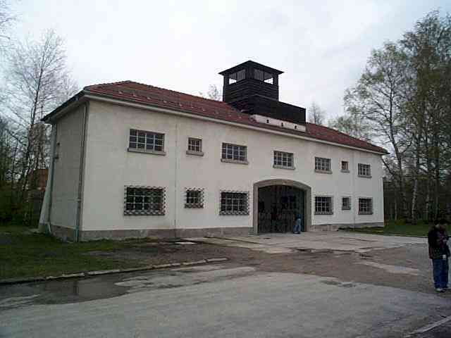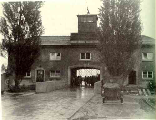 The SS offices were on either side of the gate. Guards in the tower shot without warning anyone who approached the fence. This is the inside view of the main gate.