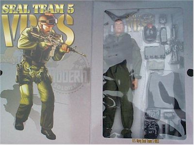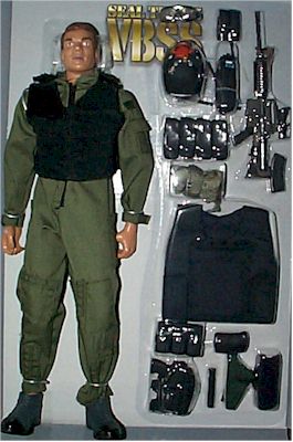 A very well equipped figure complete with body armor and hockey helmet as seen on the Delta Forces in the recent movie, Blackhawk Down. Has IR strobe on helmet for friendly forces ID. Armed with a M-4 carbine with scope. Has an extraction harness and a radio. Also comes with a HK USP 45 pistol and numerous ammo pouches. These type Special Operations are currently working in Afghanistan and also patrolling the Persian Gulf to make sure no rats escape by boat. A new figure that won't last long. $28.95