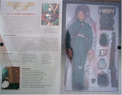 Incredible detail that accurately portrays a soldier of this legendary Civil War Unit. Called the US Sharpshooters, men were selected for their exceptional shooting ability and placed in this unit. Armed with the limited issued, 54 Caliber, Breech-loading Sharps rifle, these men were capable of placing 10 of 10 shots in a 3 foot square pine board at 500 yards. Their green uniforms were unique as well as their black rubber buttons which did not reflect the sunlight. This figure is 100% correct in every detail and even has the trademark Prussian Bearskin Knapsack. Limited quantities and no longer produced $39.99